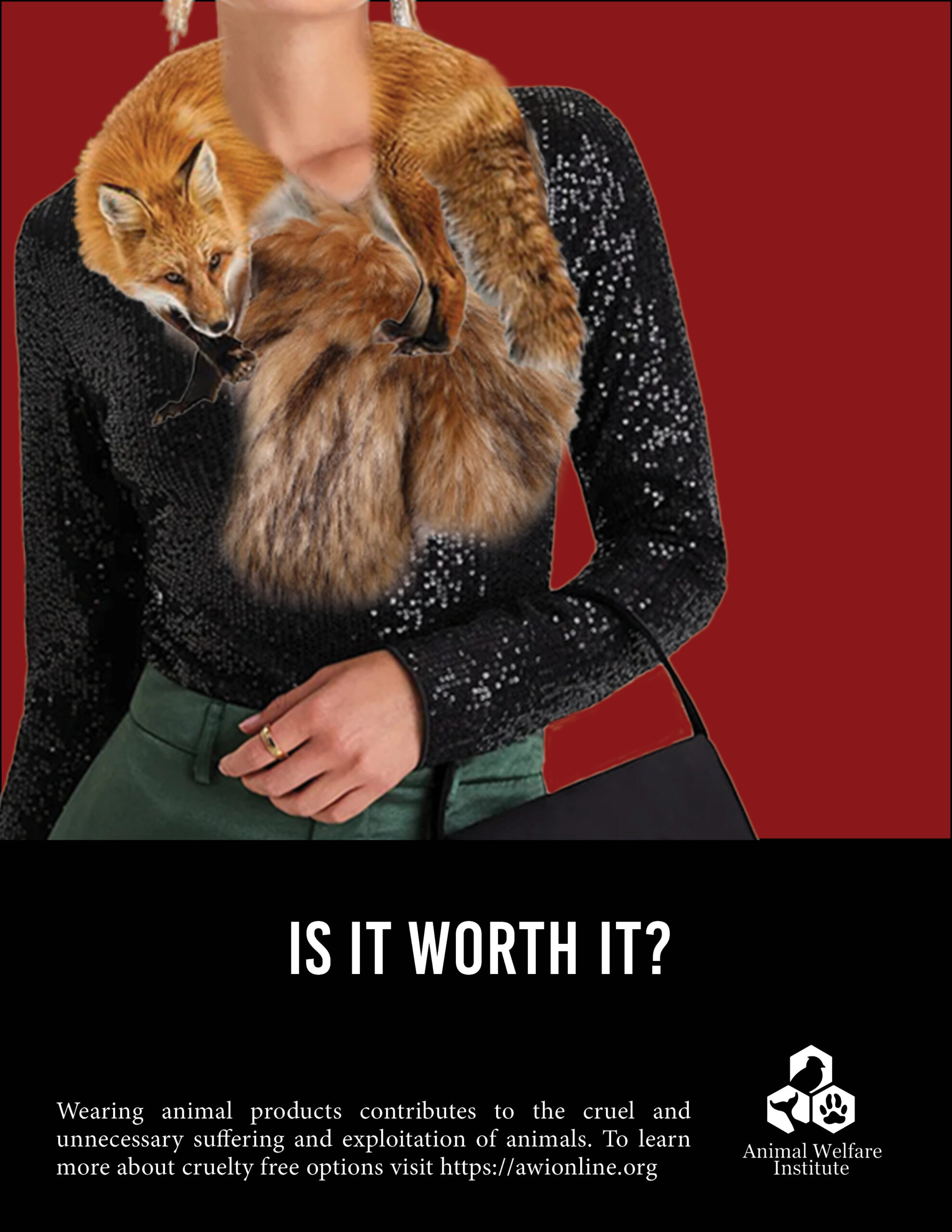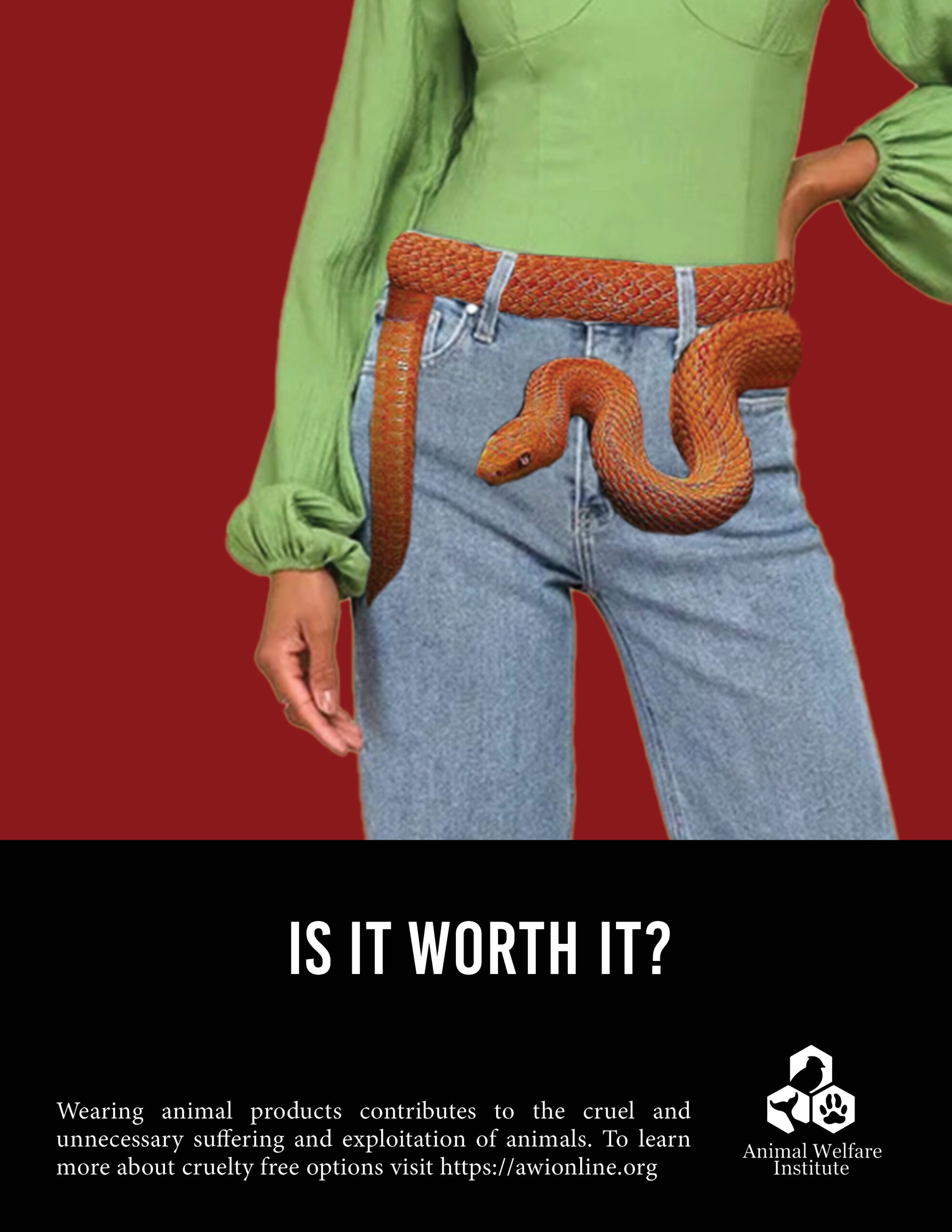 This ad campaign targets hard-working, middle-aged professional women who prioritize their appearance in their line of work. Chosen for their tendency to invest in long-lasting, high-quality clothing and accessories, this audience is introduced to cruelty-free options through three distinct ads. Each ad focuses on a different animal-derived product, such as a fur scarf, leather jacket, and snakeskin belt, aiming to raise awareness about the materials used and offer ethical alternatives. By omitting the wearer’s face and utilizing a blood red background, the ads create a powerful yet tasteful visual representation of the animal’s sacrifice, fostering empathy among viewers.